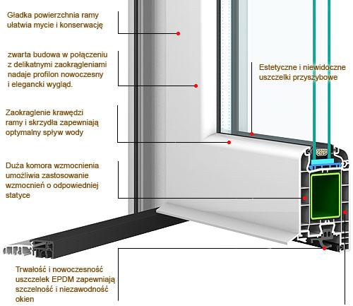 - Wielokomorowa budowa oraz głębokość ramy i skrzydła wynosząca 70 mm pozwala uzyskać bardzo dobre parametry termoizolacyjne,